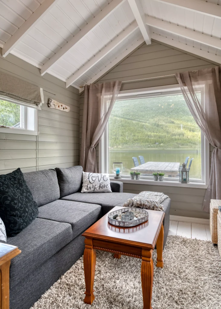 The lodge has an outdoor jacuzzi, 3 fireplaces, a grill, a fridge outside, and outdoor big screen, good outdoors both inside and outside, and 4 TVs. All necessary kitchen equipment, bed linen, and 2 washing machines/dryers. By car, it takes 3 minutes to the petrol station, 4 minutes to the sea. 6 minutes to the grocery store Coop, and 8 minutes to drive to the center of Sortland